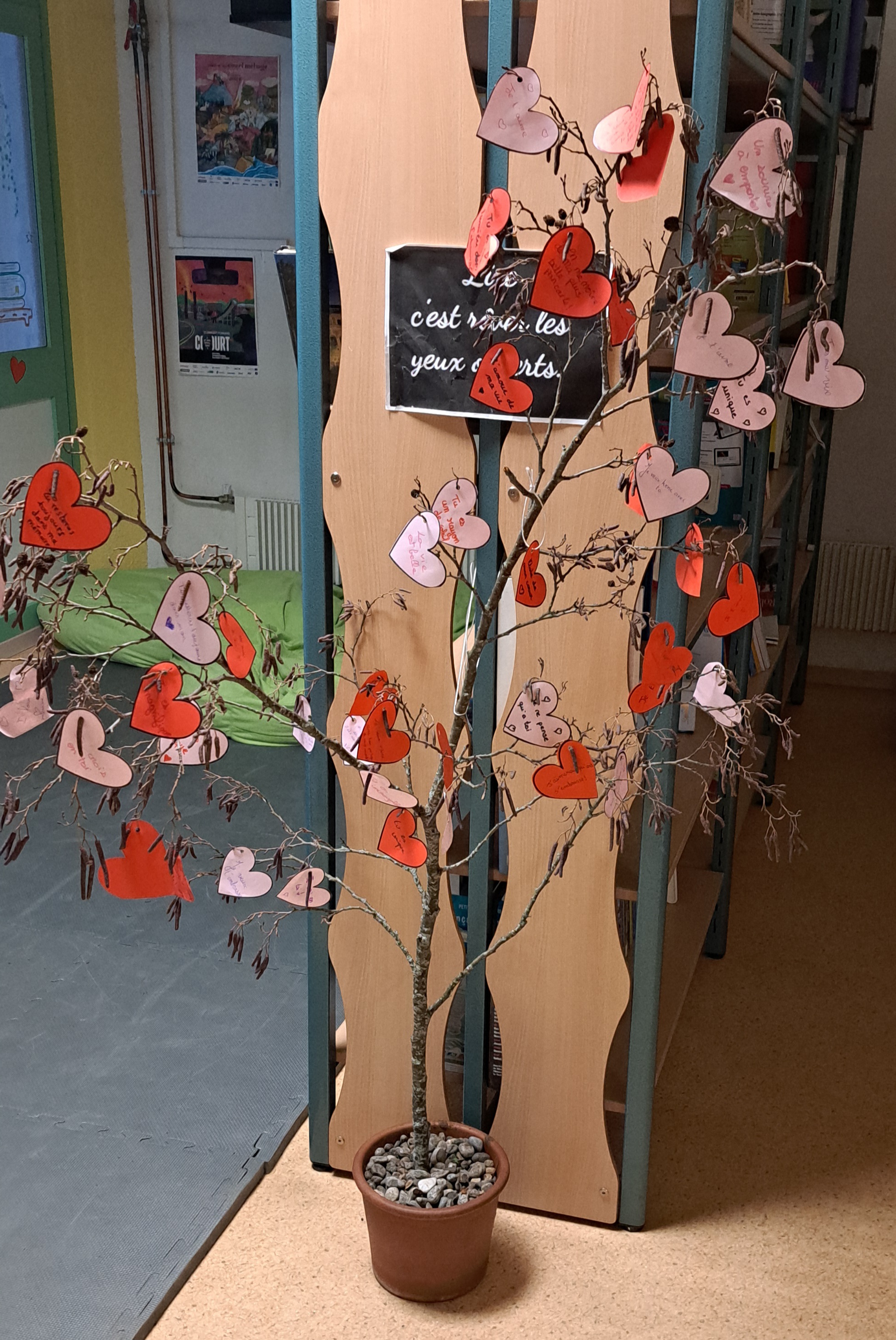 À l’occasion de la Saint Valentin, le CDI vous propose d'écrire un message d'amour ou d'amitié, anonymement bien sûr, sur un cœur rouge et de l'attacher ensuite sur l'arbre diffuseur d'amour. C'est magique ! Le vent se chargera ensuite d'envoyer le message à la personne concernée. Un peu de douceur au cœur de l'hiver…