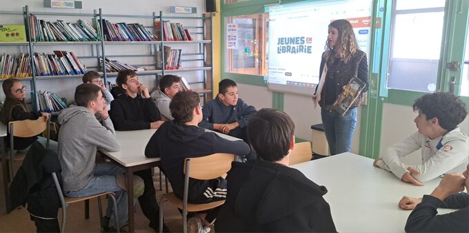 Jeunes en librairie : Mme Poitevin, libraire au Café des livres à Vic sur Cère est intervenue auprès de la classe de 4A, dans le cadre du projet Jeunes en librairie.